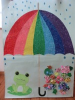 梅雨・・・「梅雨と言えば…」ご利用者様から出たのが、雨・カエル・紫陽花・カタツムリでした。それを一枚の壁画に仕上げました。傘は貼り絵、ビニールテープを雨粒に見立て、カエルは塗り絵、カタツムリと紫陽花は折り紙でそれぞれ出来るところを担当し仕上げました。