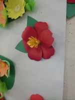 椿と福寿草は、季節の花を画用紙で作成。花びらの丸みや花弁を立体的にすることでリアル感を出した。