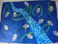 蛍・・・・・貼り絵で背景を仕上げ蛍を飛ばしました。