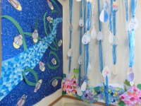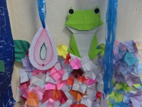 梅雨・・・・折り紙で紫陽花やカエルを作成し、雨のしずくを描きました。しずくも描く人それぞれの個性が出ていました。