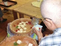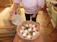 移動式でご自身の所に回ってくるのを皆さん嬉しそうに待たれ、たらいに浮かんでいるキンキンに冷えたお豆腐やトマトをすくい、好きな薬味をトッピングして食べていただきました。