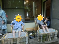 足湯コーナーでは、長門市の湯本の湯でリラックス。記念撮影は、コロナ終息を願いアマビエになりきってもらいパシャリ!