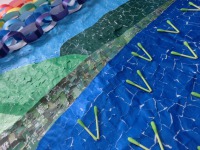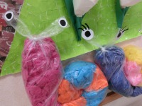 中綿を入れ接着した布を金魚の形にハサミで切ってもらい、目・口をつけヒレを書いて自分だけの金魚を作りました。