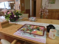 完成したお花をテーブルに飾り、周囲には桜を咲かせお花見の雰囲気を出し、スタッフが春の曲をいくつかウクレレで演奏し、心地の良いBGMの中でお弁当を食べました。