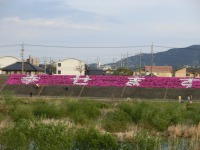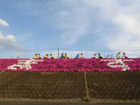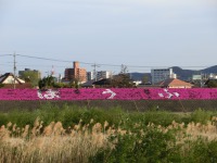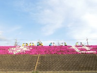 防府市を流れる佐波川の遊歩道沿いに芝桜が一面に咲き誇り、防府ブランド「幸せます」の文字が浮かび上がっています。