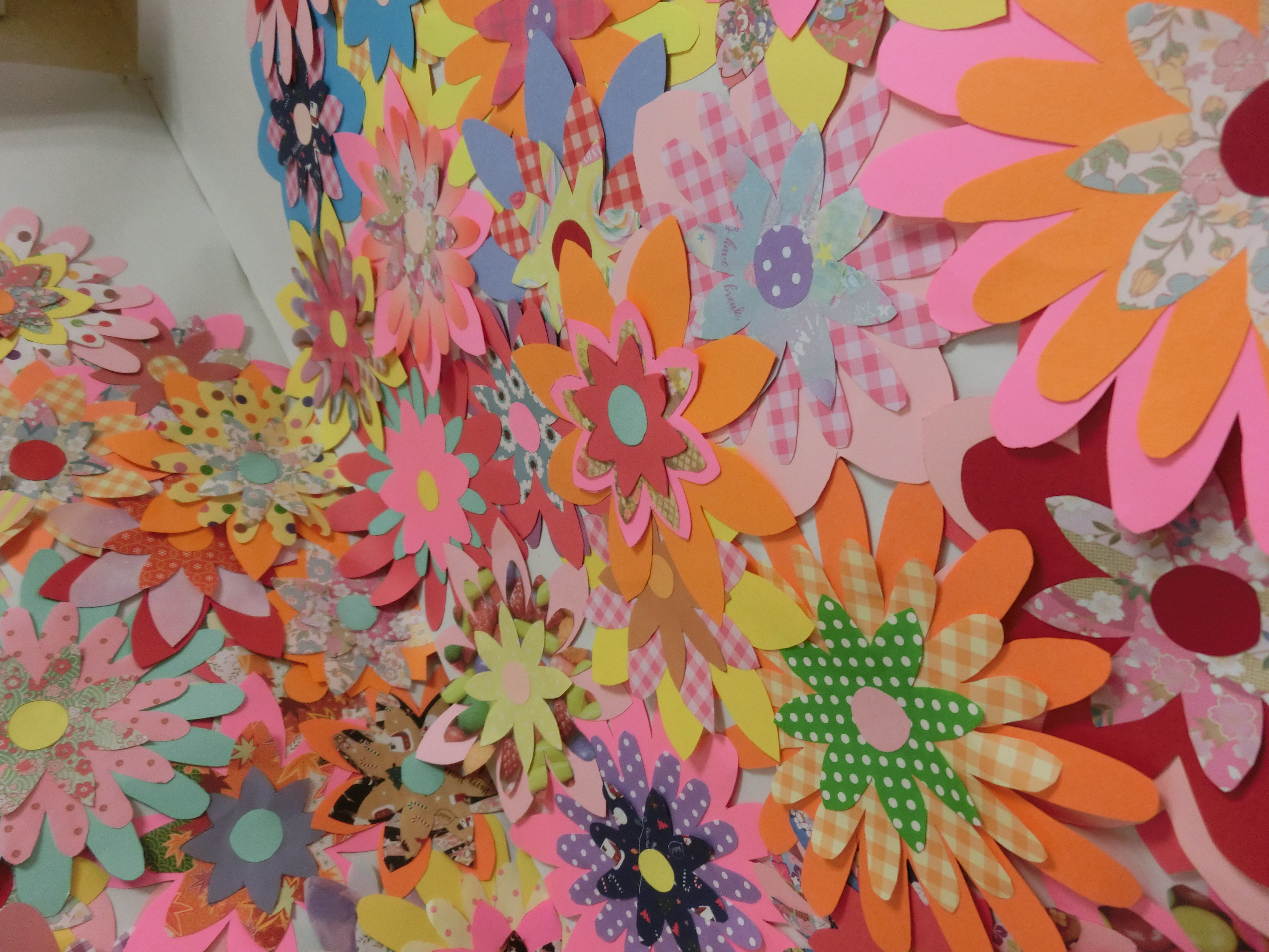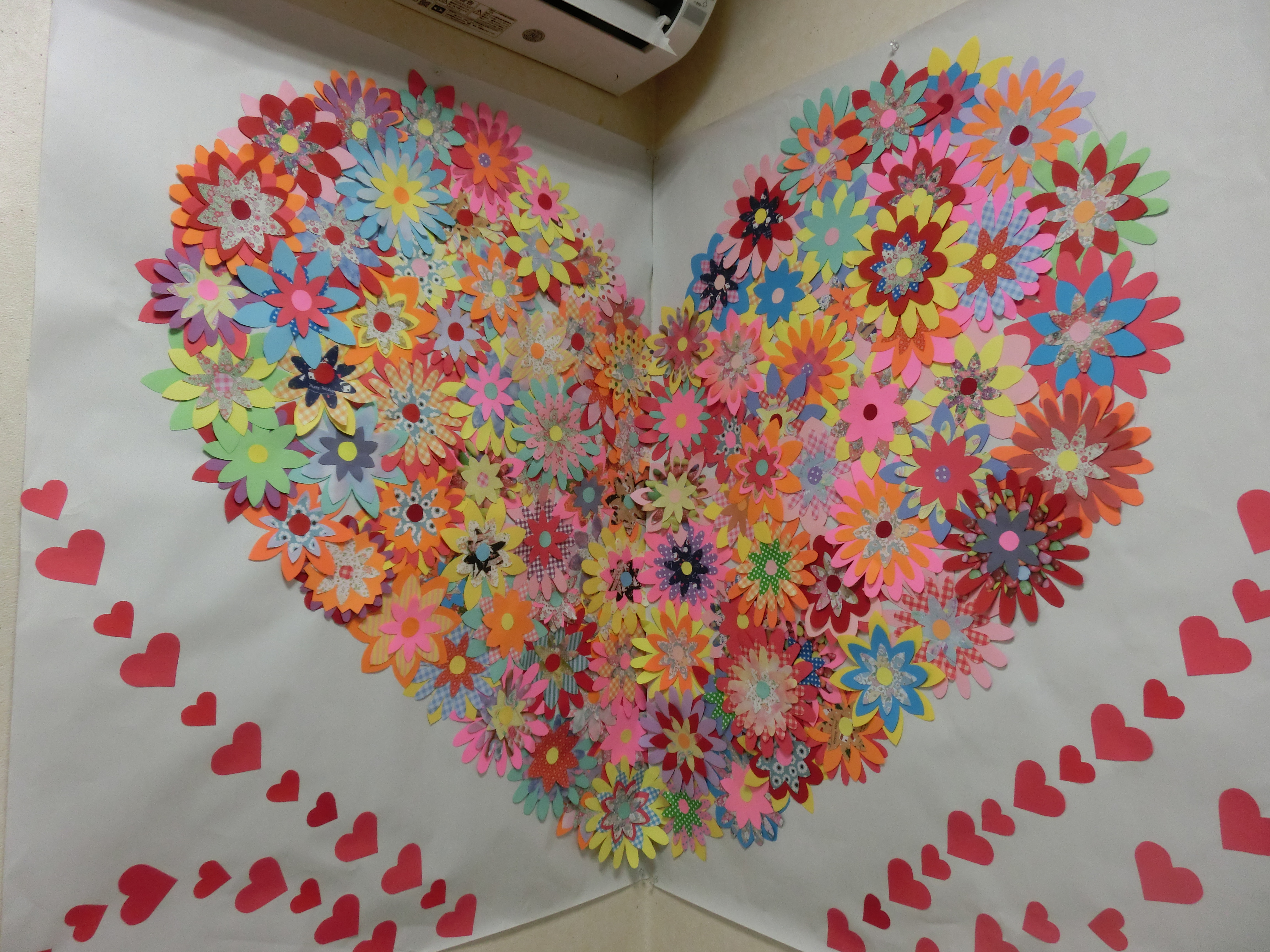 バレンタインの壁画は、色とりどりのお花をしきつめてハートを作りました。