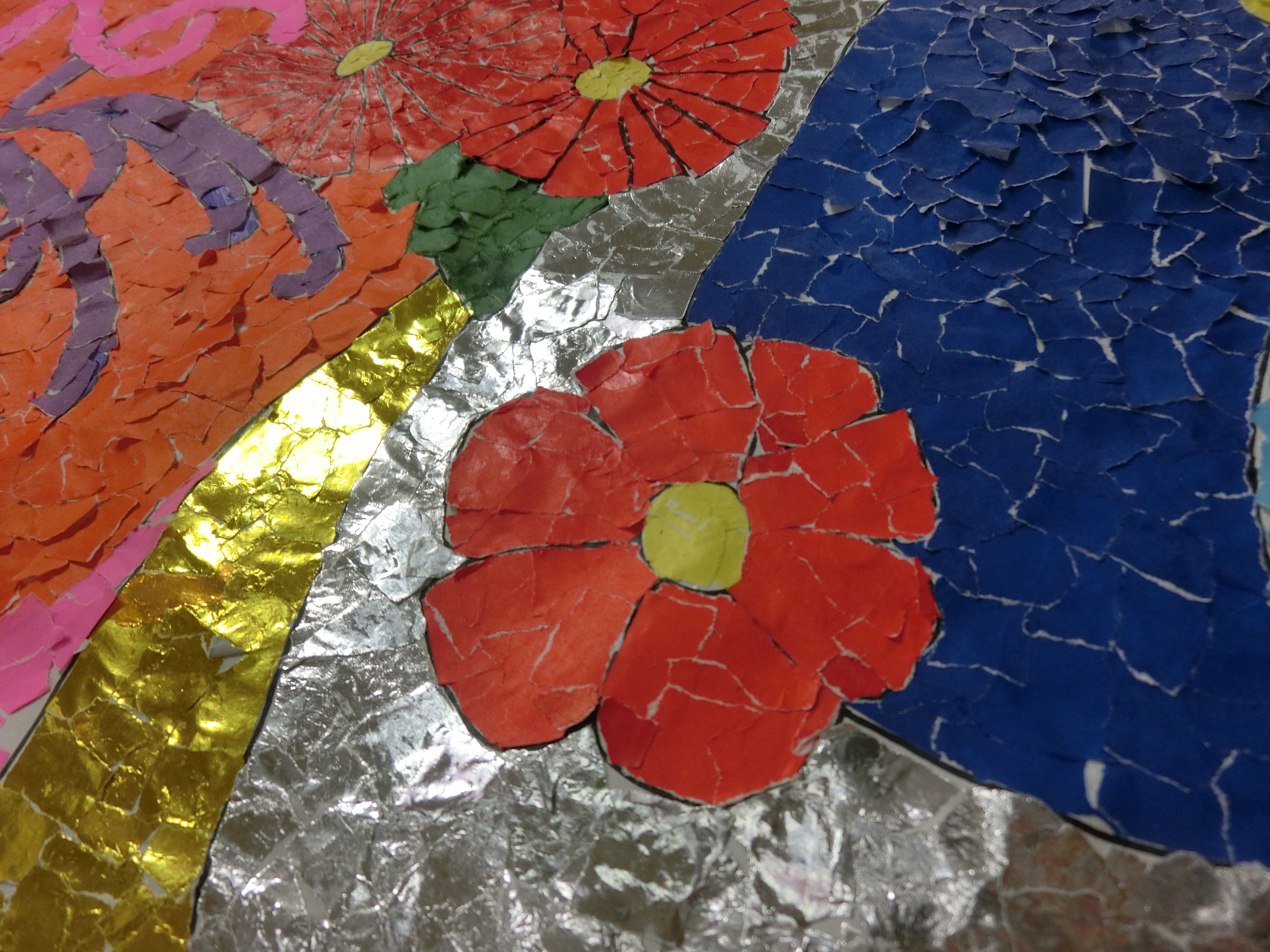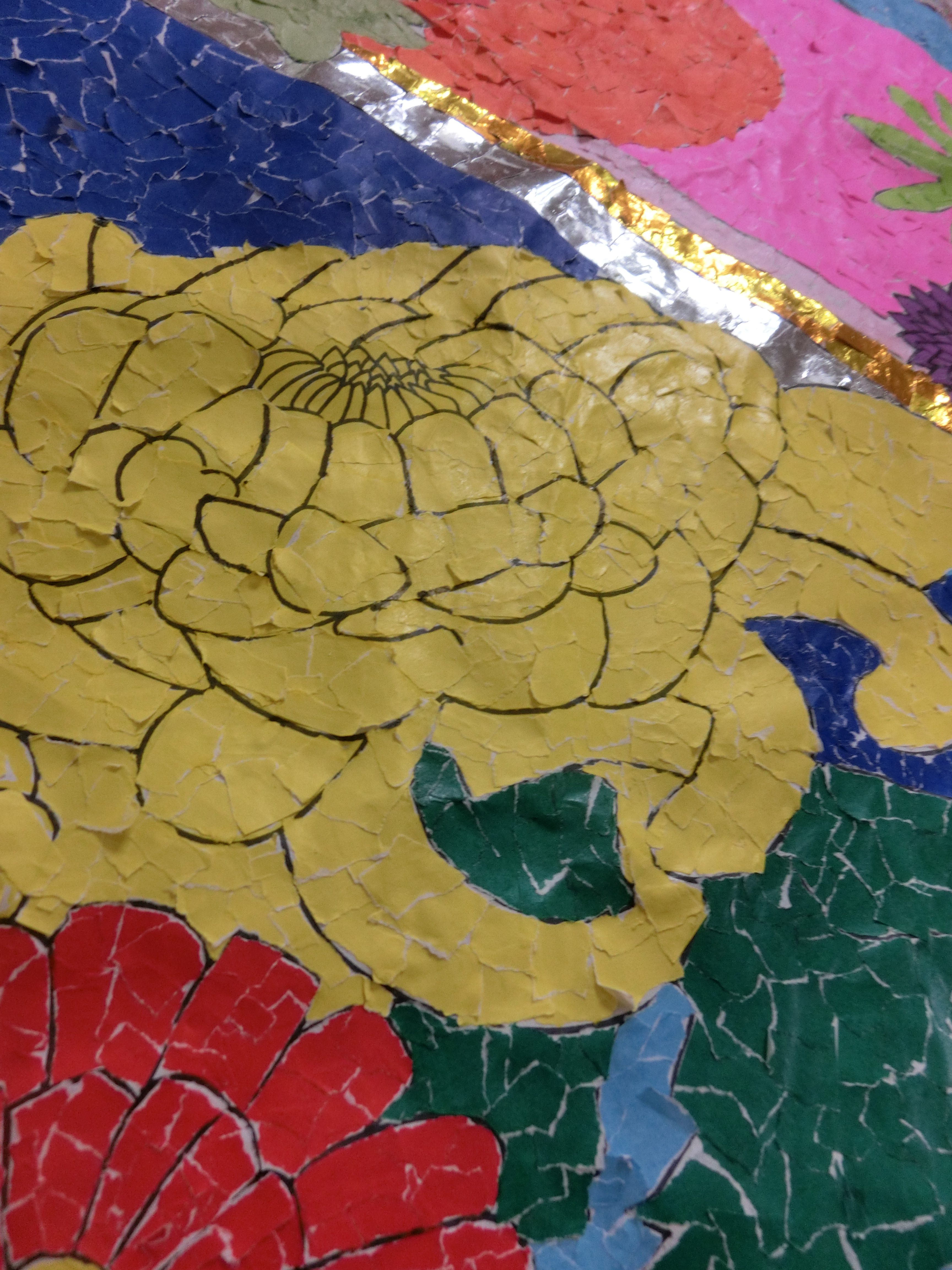 菊は、折り紙を細かくちぎり1枚1枚貼りました。