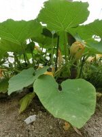 順調に育ったかぼちゃの苗を、鉢から花壇に植え替えました。