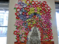 梅雨入りの時期を考えて、色合いを明るくしました。しずくと傘は風でゆられ、ご利用者様から「傘の色合いが良い」や「しずくのゆれ具合いも感じが出て良い」との評価を受けました。また、薔薇園の作成では、遠近感を出すために大小様々な大きさの薔薇を作成しました。