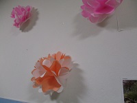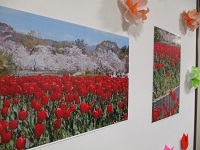 チューリップの飾りと、折り紙で作った花飾りは