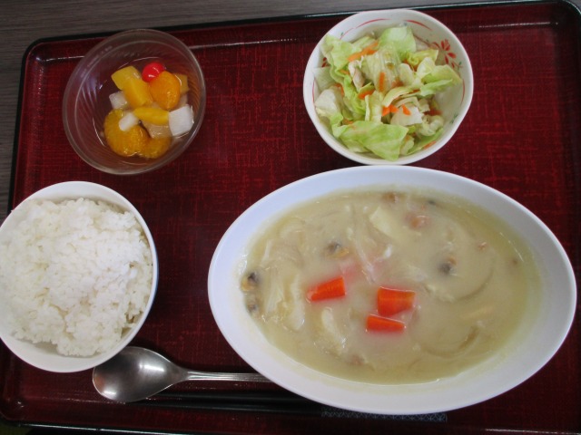*ご飯 *シーフードシチュー *サラダ *フルーツポンチ でした(^^♪