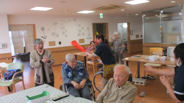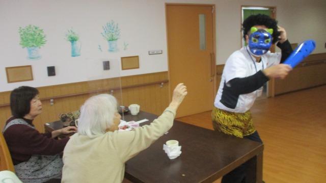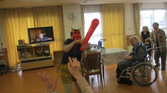 はぴね神戸魚崎にも【鬼】がやってきました‼3階は赤鬼、1.2階は青鬼が出没したようです(;’∀’)みんなで鬼を退治‼「鬼は外~‼」と元気よく豆を投げ、無病息災を祈願しました(*^-^*)また「福は内‼」と…なかなか歳の数とはいきませんが(笑)皆で豆や甘納豆を食べました(^^)お昼ご飯は【節分巻き】でした👹