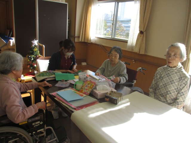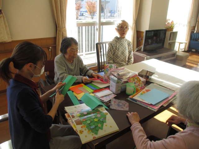12月はご利用者様と看護師スタッフで楽しい製作レクリエーションがたくさん行われています(*^-^*)その中のひとつをご紹介☝‼何やら楽しい雰囲気で折り紙をチョキチョキ✂とても集中されていますね🌟皆様手先が器用で素晴らしいです(^^)出来上がった作品を見てビックリ‼とても大きなクリスマスツリーでした‼かわいい~(⋈◍>◡<◍)。✧♡