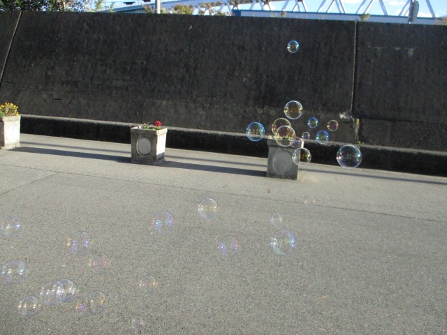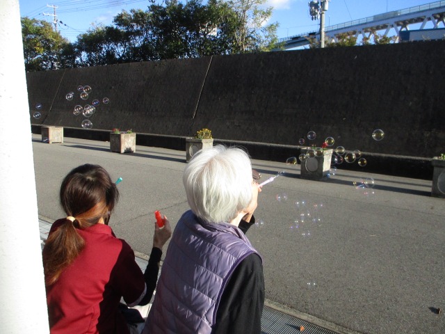 玄関前のベンチを覗いてみると、シャボン玉で遊んでいる2人を発見!!