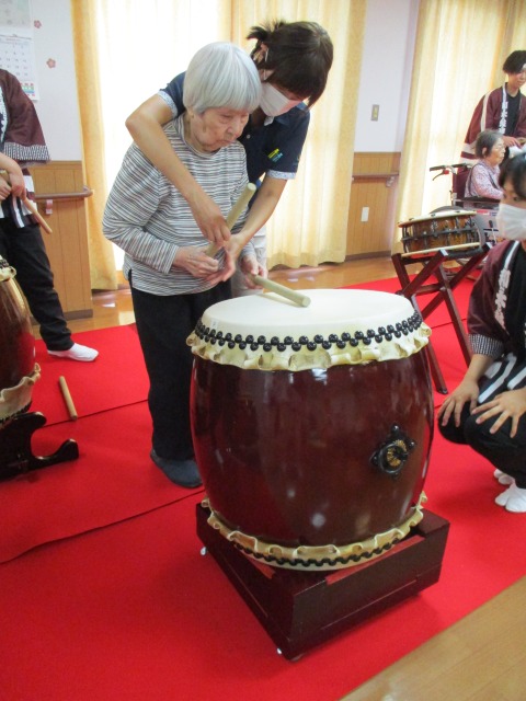 途中に利用者参加での太鼓演奏体験もあり、初めてのバチにドキドキワクワク。。。