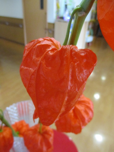 今日から8月‼【夏本番】ですね🌞うだるような暑さが続き、雨が恋しく思う今日この頃です☔お世話になっている方より【ホオズキ】をいただきました(*’▽’)きれいなオレンジ色の袋状のものはガクと言われるもので果実を包み込んでいるのだそうです‼玄関で施設に来られるお客様の目を引いています(^^)