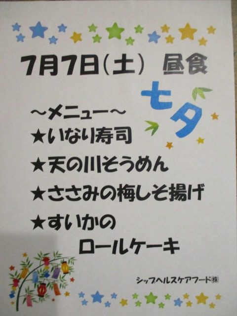 今日は【七夕】ですね🌟パラパラと雨が降っていましたが、今は止んでいます(*^-^*)彦星様と織姫様は無事に会えたでしょうか?はぴね神戸魚崎でもお昼は七夕メニューでした🍴短冊に願いごとを書いていただき、各フロアに笹を飾りました(^^♪皆様の願いごとが叶いますように🌟🌟🌟