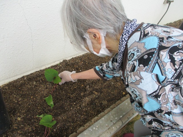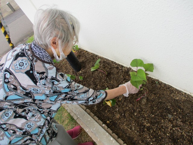 今日は小雨が降ったり止んだり・・・///すっきりしないお天気ですね☔ご利用者様と一緒にサツマイモ🍠の苗を植えました🌱🌱🌱スタッフが穴を開け、そこに苗を入れて土をかぶせて・・・手際よくコンビネーション抜群‼あっという間に植え終わりました(*^-^*)「サツマイモが出来たら何にして食べましょう(・・?」「焼き芋‼」元気に育ってくれますように🌟