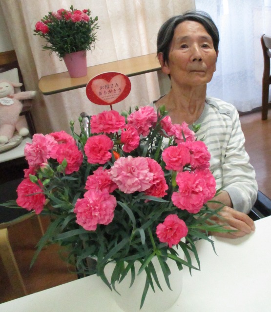 昨日は『母の日』でしたね~!!はぴねにも綺麗なカーネーションが届きました(*^-^*)同じフロアで同じテーブルのご利用者様にそれぞれピンクのカーネーションが届いたので嬉しい偶然ですね~♬と記念撮影をしました(*^-^*)