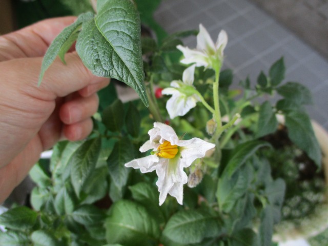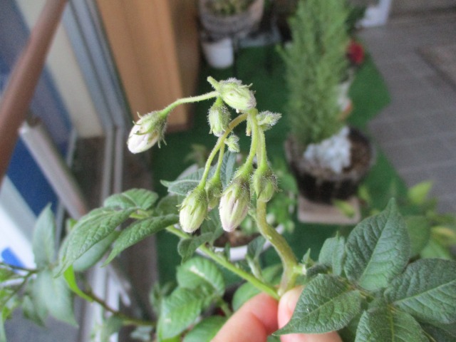 今日も晴天じゃがいも観察に行くと・・・小さな白い花が咲いていました!!他にもつぼみがいっぱいこの花がすべて咲いて・・・そしてそのあとどうなるんだろう(・・?ますますこれからが楽しみです♬毎日変化を見逃さないようにしなければ・・・(*’▽’)
