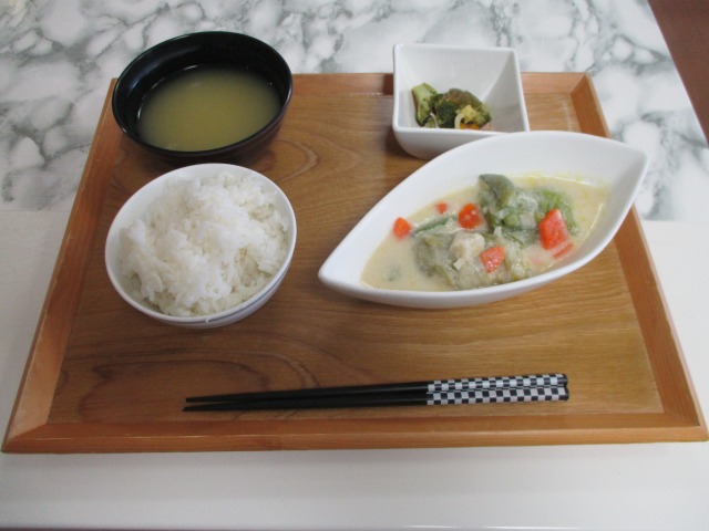 *ご飯 *ロールキャベツの豆乳クリーム煮 *彩りサラダ *スープ でした(^^♪