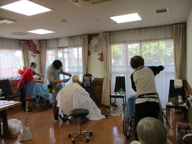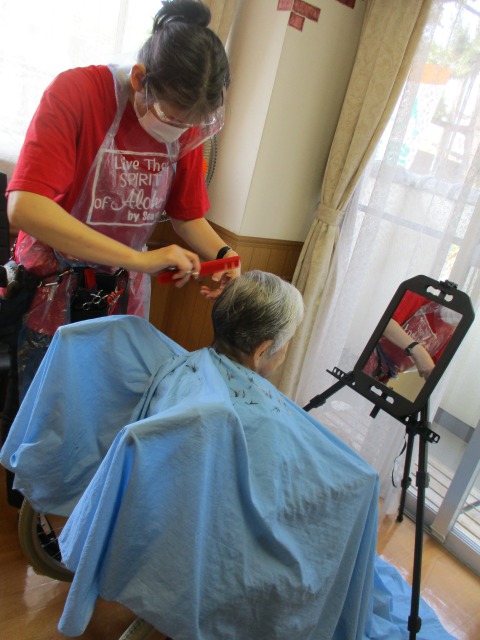 今日は午前中に散髪がありました!順番にお声かけしながらお連れしていると、エレベーターの中で「あなたみたいな髪型にしてみたいんだけど似合うと思う?」と相談されショートカットにチャレンジされたご利用者様がいて・・仕上がりは・・とてもスッキリとキレイになり、イメチェン大成功!! また他のご利用者様は「べっぴんさんになったでしょー!」と満面の笑顔!!