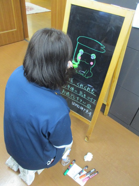 エントランスのウェルカムボードを【梅雨バージョン】に描き変えました✍絵の得意なスタッフと字が綺麗なスタッフで分担して仕上げました(*^-^*)はぴね神戸魚崎には才能あふれるスタッフが揃っています?!当施設にお越しの際はぜひご覧ください(⋈◍>◡<◍)。✧♡
