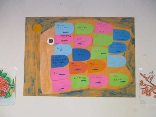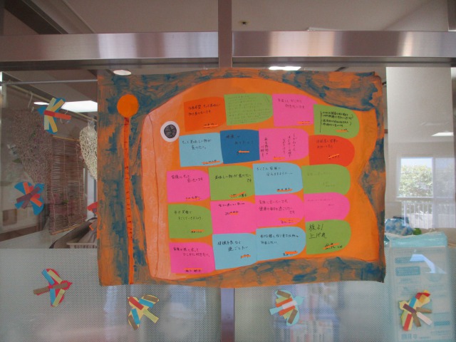 ご利用者様ひとり、ひとりに願いごとやメッセージを書いていただきました‼完成した【鯉のぼり】は各フロアに飾っています❣