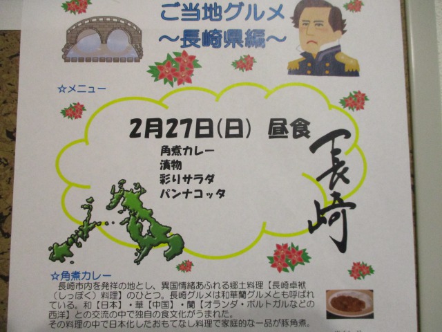 今日の昼食は、ご当地グルメ~長崎県編~でした!!私は実はカレーが少し苦手なのですが・・角煮カレーを口に運んだ瞬間・・「おいしい!」と大きい声を出してしまいました(^^♪ ご利用者様も美味しそうに召し上がっていました。皆様ぜひ試してみてください!!