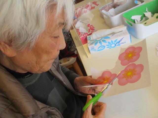 と入居者の方から歌が聞こえてきたので、急遽、桜の貼り絵をしてもらいました(^^)v