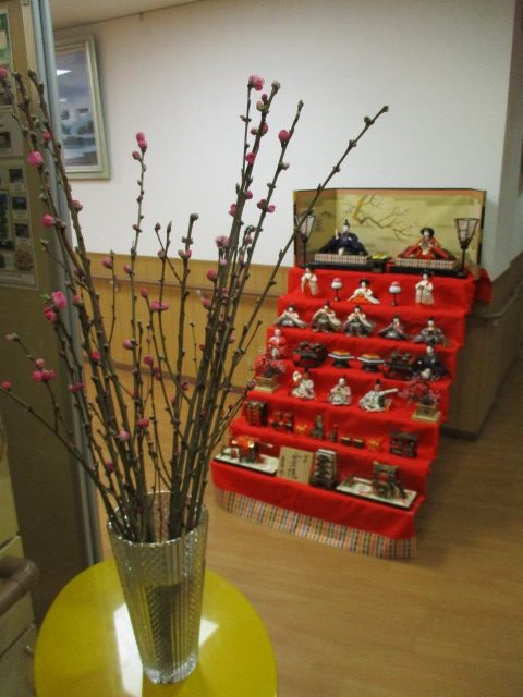 いつもお世話になっている業者様に【桃の花】をいただきました(*^-^*)ご利用者様に見ていただくと「かわいい~!」「きれい~!」とおっしゃってしばらく眺めておられました❣お雛様の前に飾ると一段と際立って春の雰囲気を演出してくれています(*^-^*)