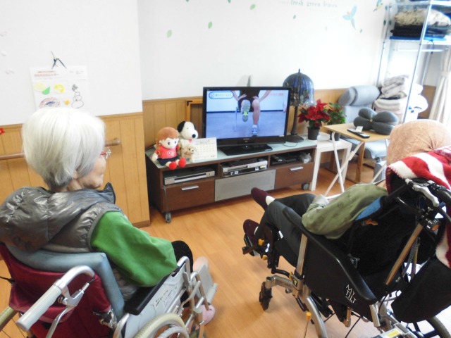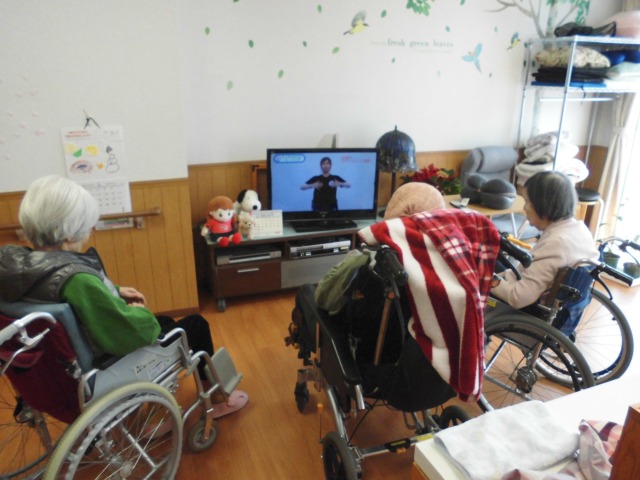 参加者を募り、仲良く体操をしていると…またお一人参加されテレビのお手本を真似ながら頑張って手足を動かされていました(*^▽^*)今日は気持ちの良いお天気!!窓から差し込む光でみんな気持ちも体もお元気です(^^)/♡