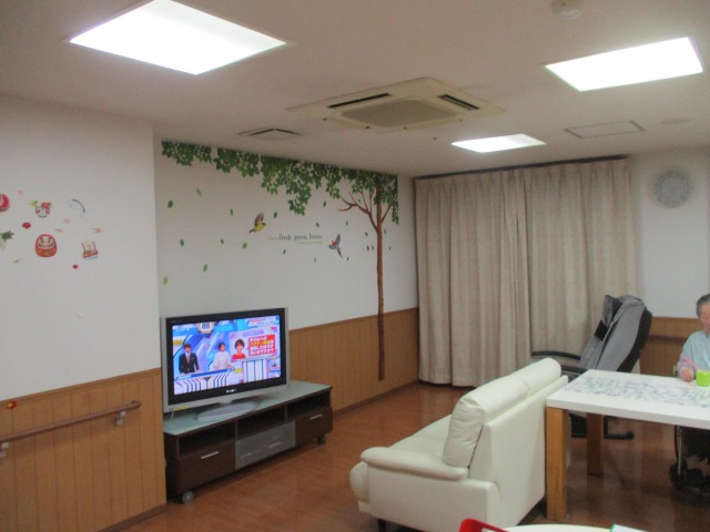 1階フロアの白い壁面を明るくリニューアルしました(*^-^*)まるで本物の木が生えてきたように、緑が増えて雰囲気がガラッと変わりました( *´艸`)「いいな~!きれいになったね~!」とご利用者様にも喜んでいただけたようです(*^-^*)