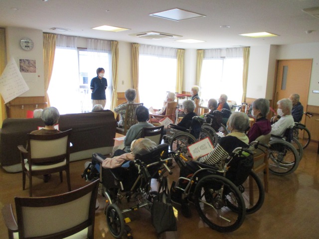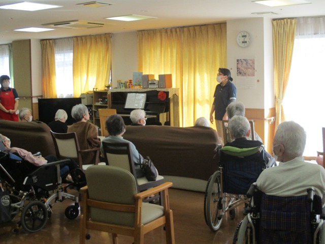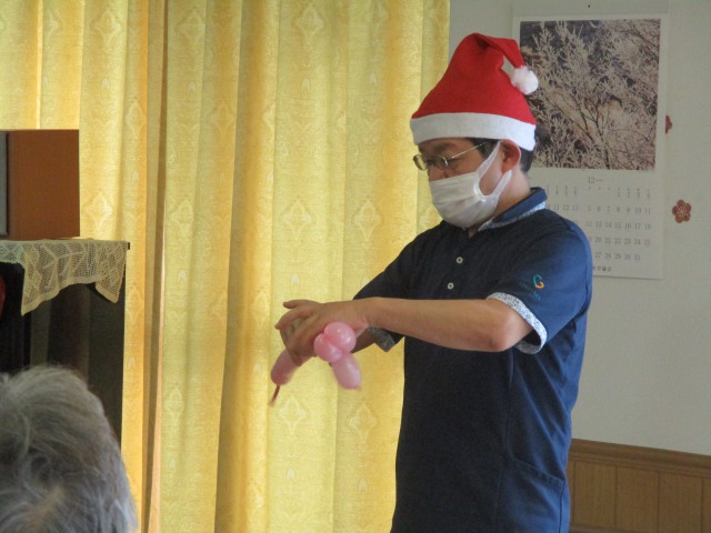 ピアノの演奏が終わり、つぎは【ジャグリング】【手品】【バルーンアート】を披露していただきました(*^-^*)とても器用な職員さんで、普段は篠笛を吹いてくれたり、なんとブレイクダンスもできるそうですΣ(・ω・ノ)ノ!また機会があればぜひ見せていただきたいですね!(^^)!「ボールジャグリング」では水晶のような球が本当に手から浮いているように見えました!!歓声と拍手があがり、一時も目が離せませんでした(@_@)