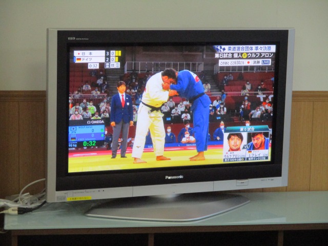1階フロアの夕食風景です(*^-^*)今日のメインディッシュはお魚🐟です!皆様、テレビでオリンピックを見ながらお食事を楽しまれています(^^♪ついつい応援に熱が入ってしまいますが、お食事もきちんと完食され楽しい夕食時間となりました🎵