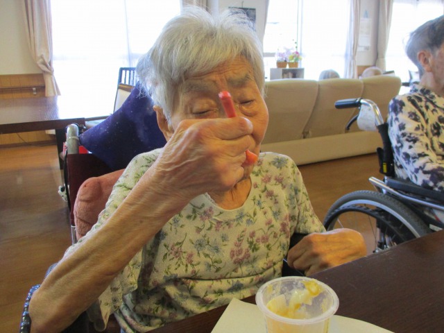 ご家族様が持ってきてくださった差し入れを届けてきました。目をキラキラさせて「どれにしよーー!」と言われてました!! 冷蔵庫に冷やしていた分をお出しすると、「おいしいわ。あんたも食べてみ!!」と優しい言葉をかけて下さり、嬉しそうに召し上がっていました(^^)/