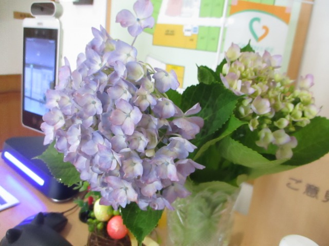 ご利用者様の息子様から、お庭に咲いているお花をお母様にと持ってきてくださいました。とても綺麗な『紫陽花』です🌻お部屋までお届けにあがると、「すぐに水切りをししないと、しばらく水につけておくわ」と言われ少しお手伝いをさせていただきました。しばらくすると事務所まで降りてこられ、「これおすそわけ」とわけて下さいました!(^^)!本当にありがとうございます。さっそく飾らせていただきました(^^)