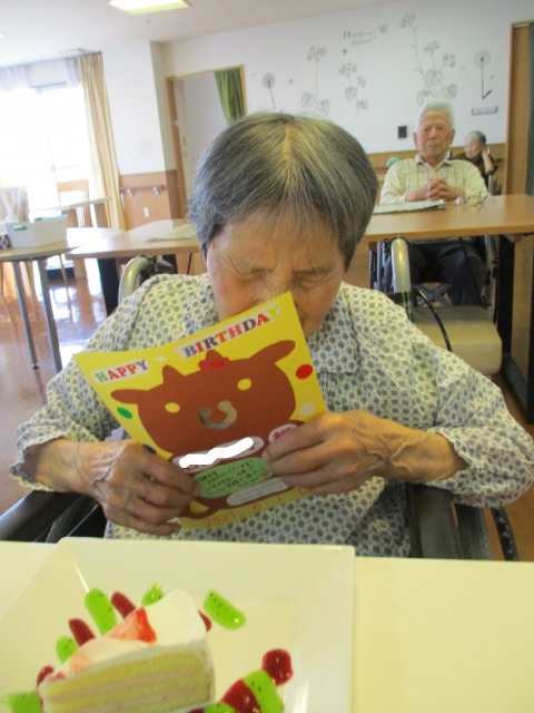 今日はご利用者様のお誕生日☆彡☆彡☆彡ケーキとバースデーカードのプレゼントをお渡しすると、ご覧のとおり素敵な笑顔を私たちスタッフに見せてくださいました‼「ありがとう!うれしいわ~!」とケーキを召し上がられました(*^-^*)いつまでもお元気でいてくださいね(^^)