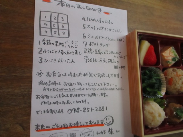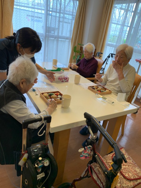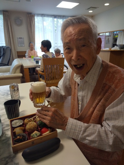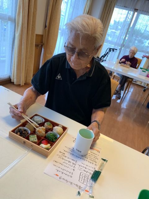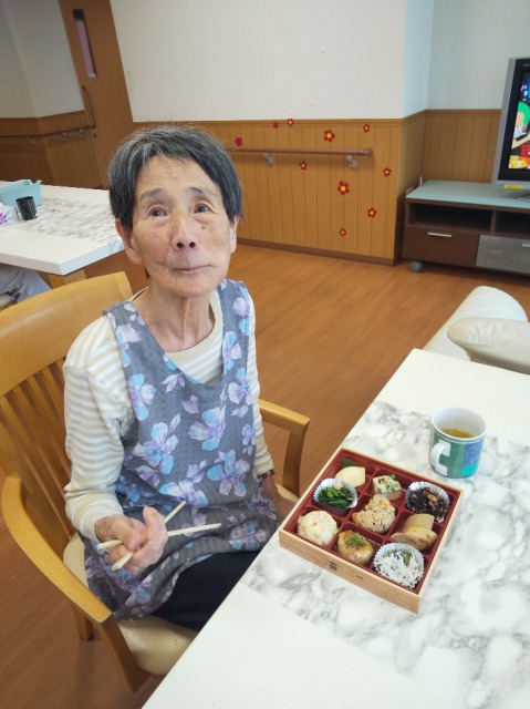 今日は前回のお寿司パーティーに続き、第二弾‼【お弁当パーティー】を開催しました(^^♪以前、出張居酒屋(夜はぴね)に来ていただいていた、和主菜『朱』さんにお弁当を注文しました!「まあ!かわいらしいお弁当!」「今日は何の日?」と皆様、興味津々です!(^^)!元気に乾杯したあとは、お品書きとお弁当を見比べられ、「美味しかった~!」とご満足いただけたご様子でした(^^)