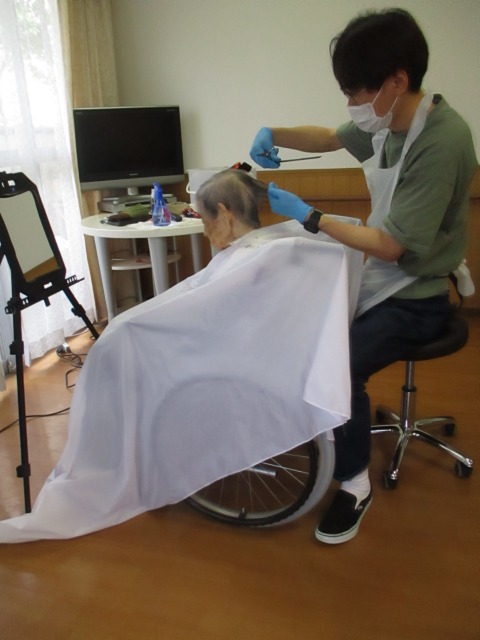 今日は月に一度の訪問理美容の日です!カット、お顔そりをはじめカラー、パーマもご希望があれば叶えてくれます(^^)あるご利用者様はお顔そりにとても喜んでいただけたご様子で、「顔がつるつるになったわ!気持ちよかったわ~」とお話ししてくださいました(^^)皆様、すっきり、リフレッシュされたようです(#^.^#)☆