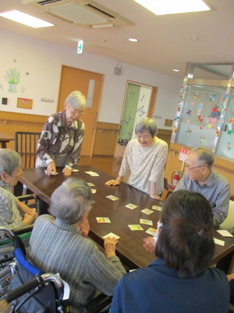 はぴね神戸魚崎ではお昼ご飯が終わり,おやつとティータイムが始まるまでに【レクリエーション】の時間を設けています(#^.^#)今日は「カルタ大会」!!スタッフが読み札係です(^^)白熱している模様です!