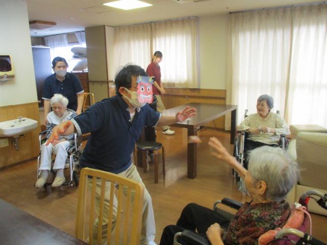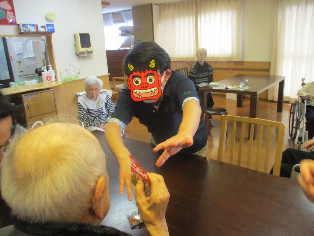 ゜+.☆゜+.☆゜+.☆ 節分といえば2月3日のイメージがありますが、今年は124年ぶりに節分が2月2日になるそうです(#^.^#)はぴね神戸魚崎でも「邪気退散!!」「招福万来!!」と願いを込めて豆まきを行いました!「鬼が来たぞ~!」の掛け声に、ご利用者様は思いっきり豆を投げるかと思いきや・・・そ~っと投げられる方や、鬼のおでこをポンと叩かれる方、「はいどうぞ♪」と豆を鬼に下さる方といろいろ)^o^(みなさま、とっても優しいです!中には「もう1回、もう1回!」と何度も投げられる方もおられ、[こりゃ、たまら~ん!」と鬼は退散して行き、フロアは笑顔に包まれました(^^)゜+.☆゜+.☆゜+.☆
