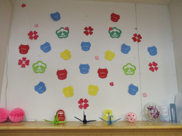 昼食にお寿司を食べて、レクリエーションの時間に豆まきをしました!