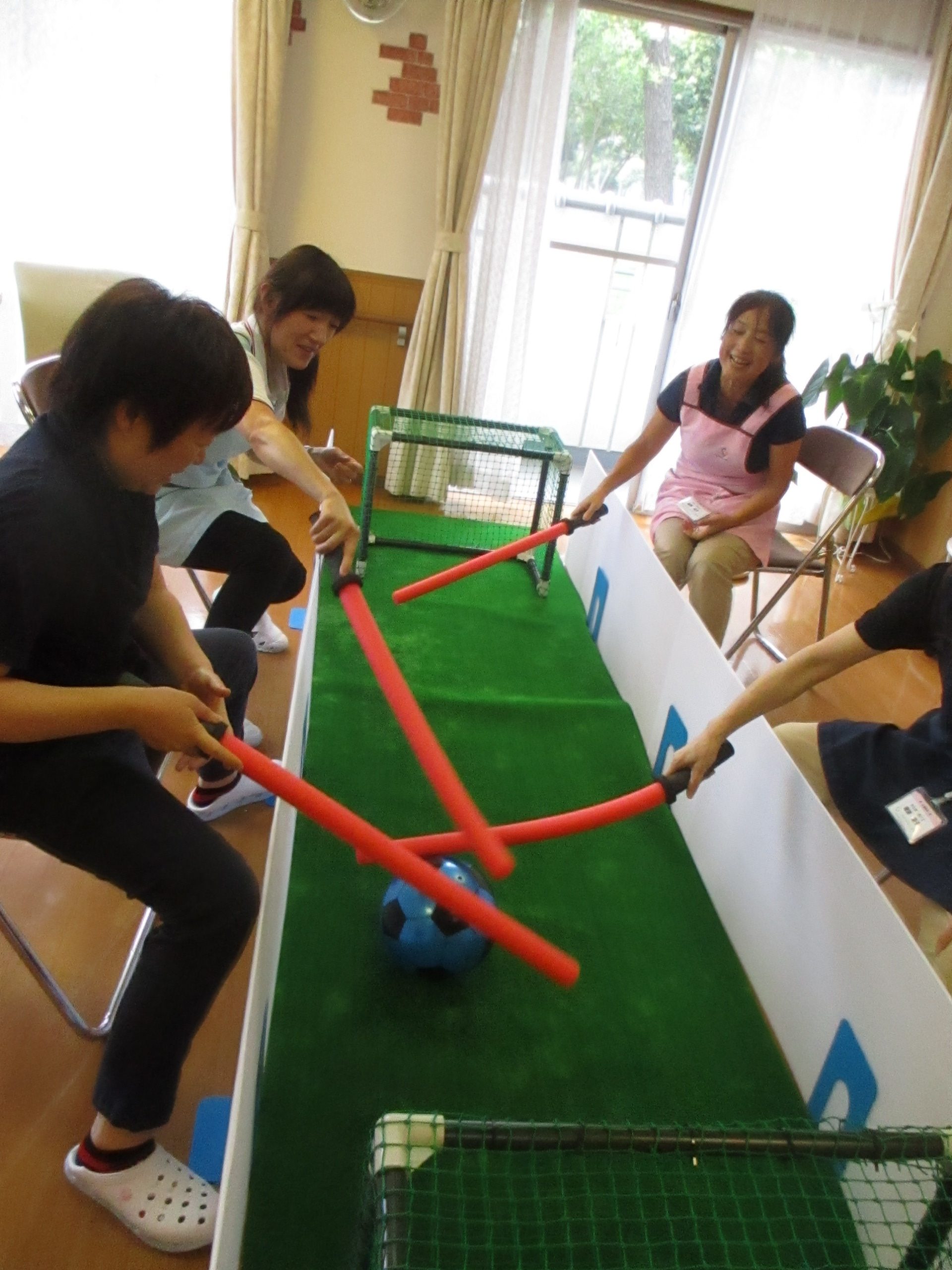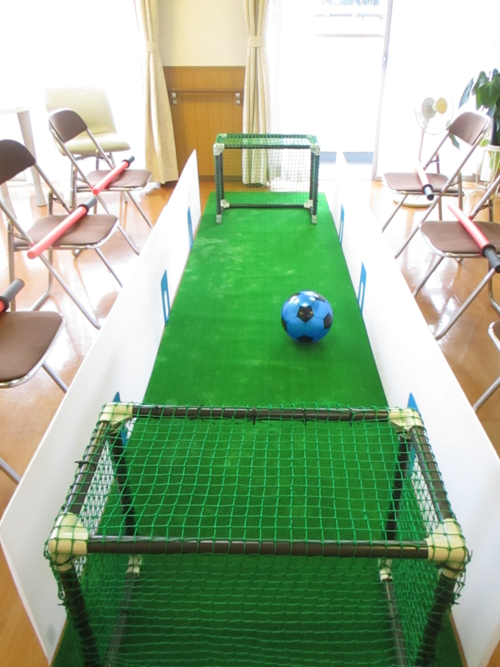 柔らかい棒を使い、ボールを相手チームのゴールへ入れます。