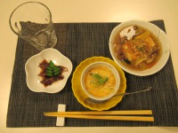 ・富山ほたるいか山椒煮 ・焼き茄子お浸し ・淡路黒鯛の南蛮漬け ・海老クリームグラタン ・さば桜干し焼きおにぎり茶漬け ・揚げだし豆腐の野菜あん