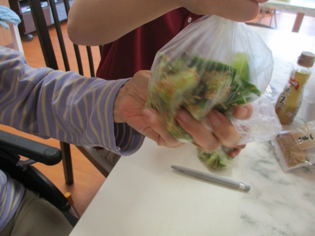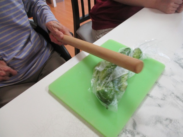 棒で叩いて・・そこにごま油、塩昆布、白ごまを加えて・・よく揉んで・・