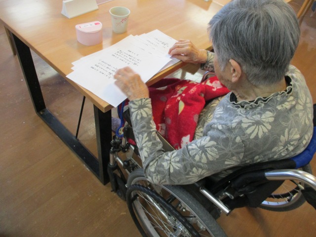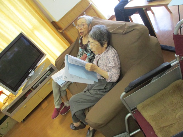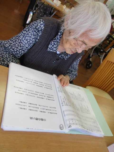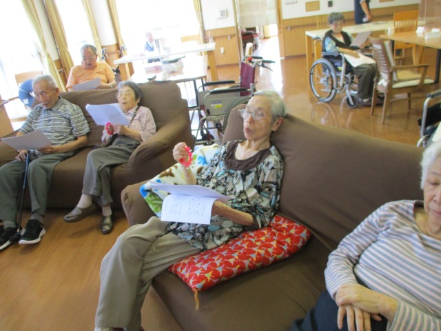 毎朝恒例のラジオ体操が終わり、スタッフ主催の【歌の会】が10時過ぎより開かれました(^^♪皆様おなじみの歌謡曲を中心に40分程歌いました♬今日は高校生のボランティアが来てくれ、歌本をめくったりご利用者様のお手伝いをしてくれました(*^▽^*)