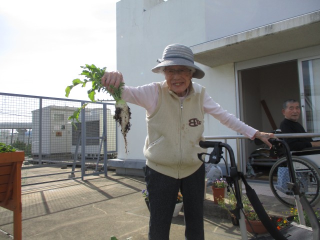 はぴね神戸魚崎の目玉!!屋上菜園は今日もなにやらにぎわっています(^o^)なんとイチゴの次は【大根】が収穫できたようです(*^-^*)新鮮なのでその場で試食もしました「辛くなく美味しい!!」と皆様大喜び!!とってもきれいな真っ白な大根(⋈◍>◡<◍)。✧♡他にもブロッコリーやなすび、唐辛子、ゴーヤ、にんじんも育てているのでまたご報告しますね(*^-^*)