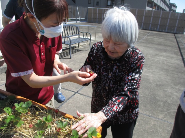 屋上菜園では今日は男性3名でいちご🍓の収穫をしたようです(*^-^*)3名で仲良くいちごを召し上がられました!!甘かったり、ちょっとすっぱかったりそれぞれ違う味だったみたいですが…^^;自分達で栽培したものを食べるって楽しみでもあり、それを他の方たちと共有する楽しさもまたとても素敵なことですね(⋈◍>◡<◍)。✧♡