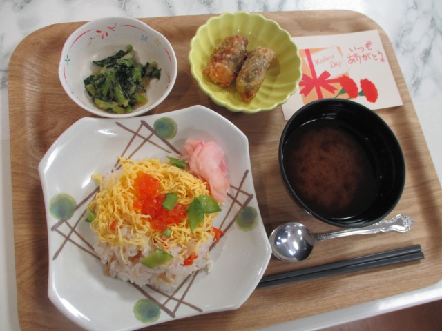 今日は母の日ですね(*^^*) お昼ご飯はちらし寿司です!皆様お好きなので美味しそうに召し上がっておられました。皆様、お母さんに感謝の気持ちを伝えられましたか?? 私も今日帰ったら「産んでくれてありがとう」と伝えたいと思います(*^^*)